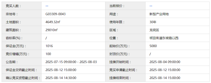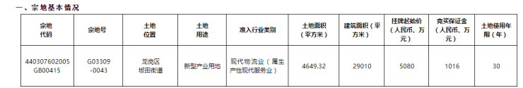 龙岗坂田的G03309-0043宗地为新兴产业用地,准入行业为现代物流业(属生产性现代服务业),土地面积4649.32㎡,建筑面积29010㎡,挂牌起始价5080万元,土地使用年限30年。