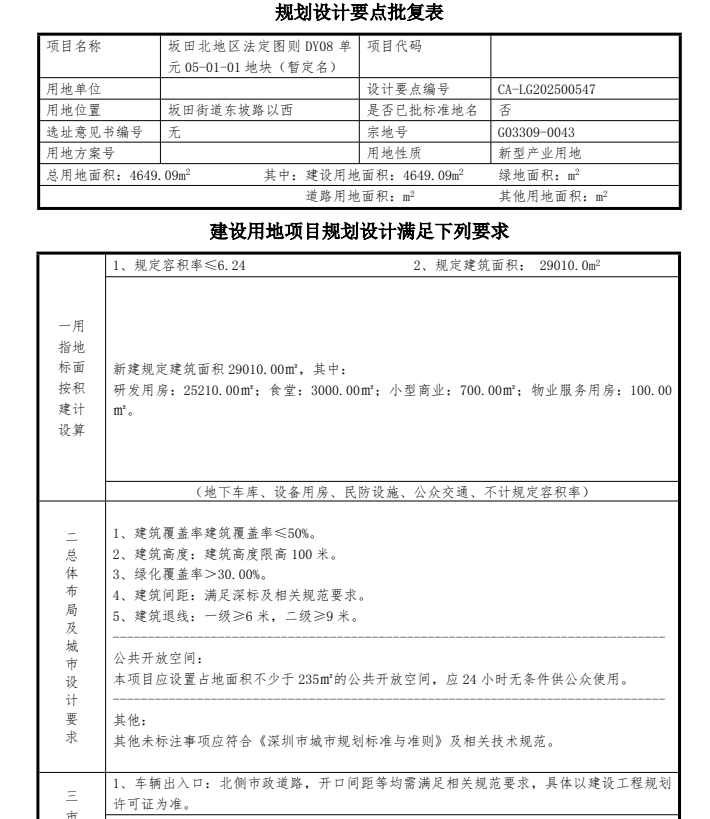 地块规划设计要点,规定容积率≤6.24,规划建筑面积29010㎡,其中:研发用房:25210.00㎡;食堂:3000.00㎡;小型商业:700.00㎡;物业服务用房:100.00