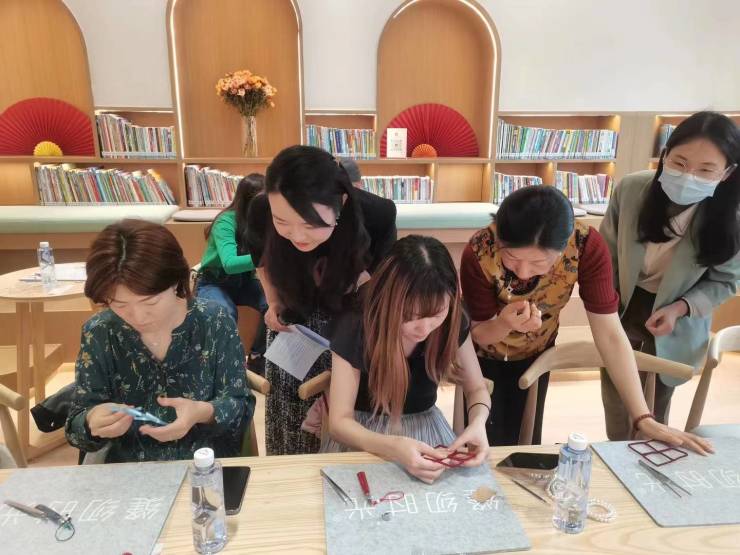 大家摆弄着手中的绳子迫不及待想要尝试。老师结合教学视频和自己手中的操作向大家展示盘扣的制作过程,有人遇到困难老师及时给予解答。绳子在大家的手中绕来绕去,最终形成盘扣的雏形。接着再在老师的指导下对盘扣形状进行微调,形成成品——精美的如意盘扣。制作完成后,大家纷纷和自己制作的盘扣合影留念,记录这次有趣的中华传统手工活动体验。