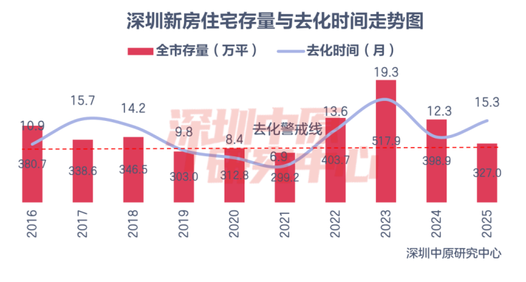 首先来看新房,尽管2025年深圳新房去库存效果显著,截至年末,深圳新房住宅存量为327万㎡,创四年来新低。