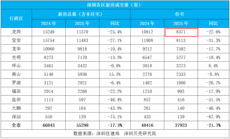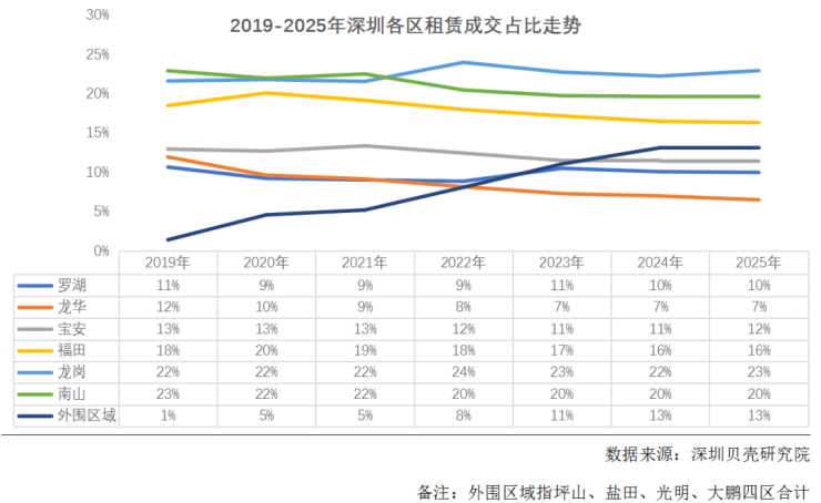 深圳贝壳研究院统计数据显示,2025年龙岗租赁成交占比为23%,较2024年扩大了1%。