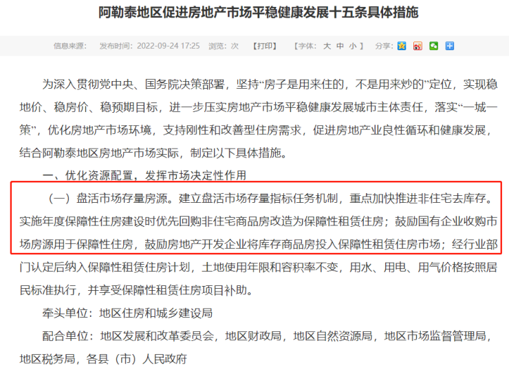 9月24日,新疆阿勒泰地区行政公署发布《阿勒泰地区促进房地产市场平稳健康发展十五条具体措施》。