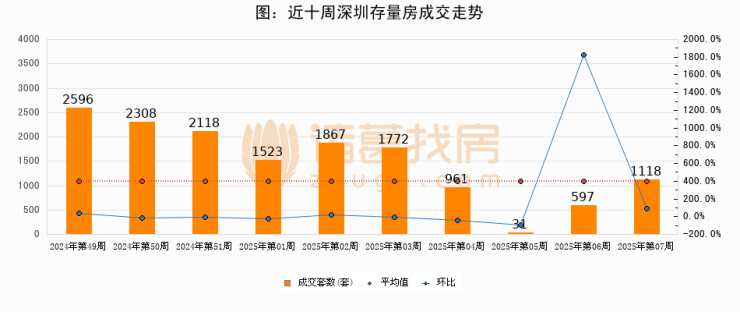存量房方面,第07周深圳存量房成交1118套,较上周增加521套,环比上涨87.3%。从近十周成交走势来看,周均成交套数为1489套,本周低于平均水平24.9%。
