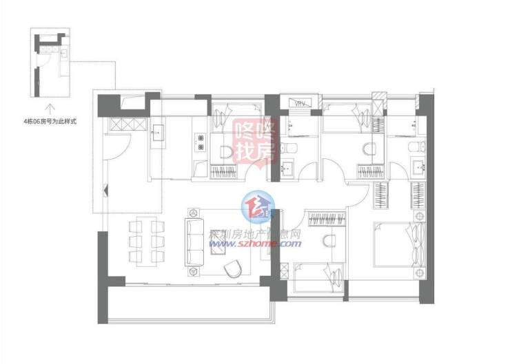 四房的D1,D2户型基本格局相同,采用客餐厅一体化设计。两者差别主要体现在,餐客出阳台,或是阳台延伸卧室窗户外。