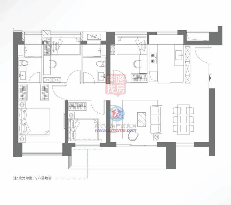 该户型每个空间都设有大采光面,自然通风采光性能良好。同时全屋采用全飘窗设计,包括卧室、厨房均利用凸窗做到了尺度的极致拓展。