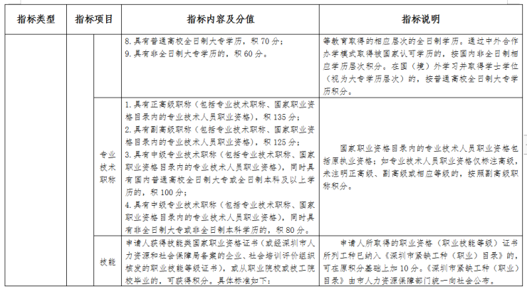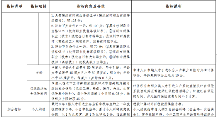 基础指标:包括学历、专业技术职称、技能、年龄和在深缴纳社会保险时间;