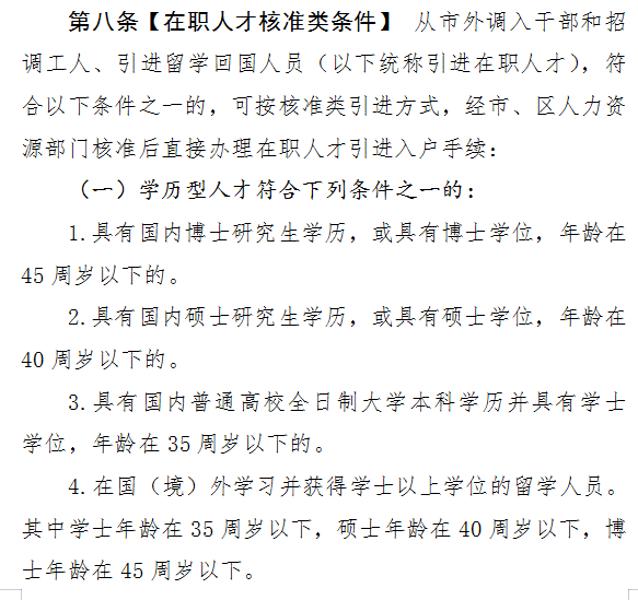 不符合上述核准条件的其他人才,通过积分方式择优审批引进。也就是说,以前全日制大专可以直接入户,但现在只能通过积分入户了。此外,本科收紧到35岁,硕士收紧到45岁。