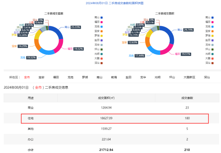 2024年8月1日二手房住宅网签180套。宝安23套;福田36套;龙岗39套;罗湖24套;南山39套;盐田2套;龙华14套;光明0套;坪山3套;大鹏0套。