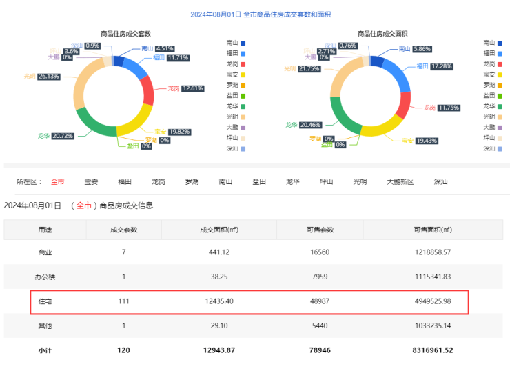2024年8月1日新房住宅共网签111套。宝安22套;福田13套;龙岗14套;罗湖0套;南山5套;盐田0套;龙华23套;坪山4套;光明29套;大鹏0套;深汕1套。