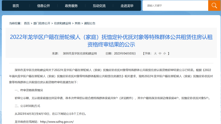 深圳市龙华区住房和建设局关于2022年龙华区户籍在册轮候人(家庭)抚恤定补优抚对象等特殊群体公共租赁住房认租资格初审结果公示已结束。根据《2022年面向龙华区户籍在册轮候人(家庭)抚恤定补优抚对象等特殊群体配租公共租赁住房通告》相关要求,现将2022年龙华区户籍在册轮候人(家庭)抚恤定补优抚对象等特殊群体公共租赁住房认租资格终审结果通告如下: