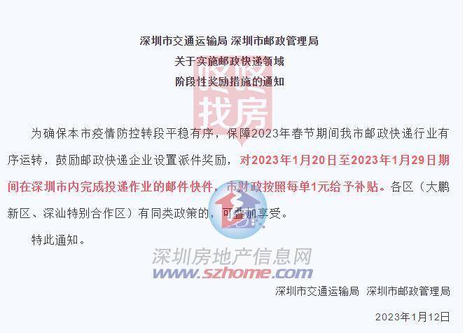 刚刚(1月12日),深圳市交通运输局 深圳市邮政管理局发布通知,为确保本市疫情防控转段平稳有序,保障2023年春节期间我市邮政快递行业有序运转,鼓励邮政快递企业设置派件奖励,对2023年1月20日至2023年1月29日期间在深圳市内完成投递作业的邮件快件,市财政按照每单1元给予补贴。各区(大鹏新区、深汕特别合作区)有同类政策的,可叠加享受。