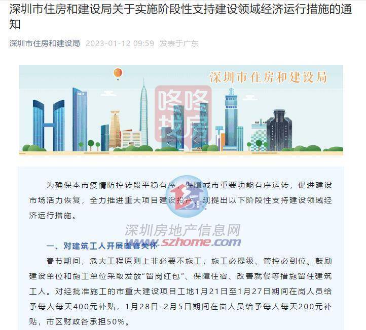 深圳住建:鼓励补贴建筑工人春节留岗,实施阶段性支持建设领域经济运行措施