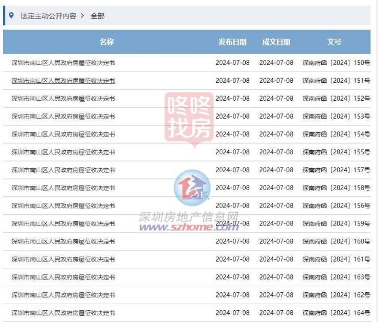 7月8日,深圳市南山区人民政府发布了《房屋征收决定书》,对南山区南头街道南苑新村城市更新单元项目范围内的未签约的多套房屋进行征收。