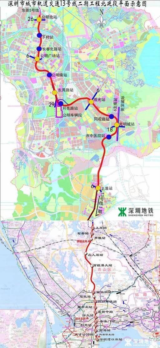 13号线二期(北延)起于上屋站(不含),止于公明北站,线路全长约19.23km,设站11座,车辆段1座,全部采用地下敷设。