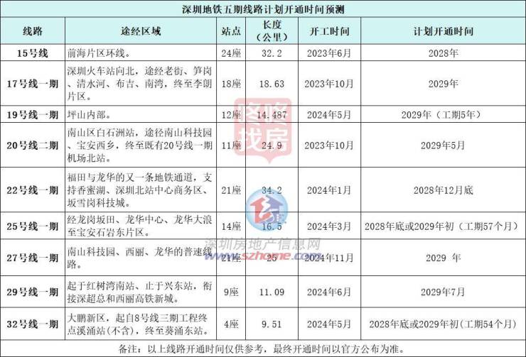 ● 五期:15号线、17号线、19号线、20号线二期、22号线、25号线、27号线、29号线、32号线,五期的10号线东延线(深圳段)和11号线北延段(深圳段)还没开工。