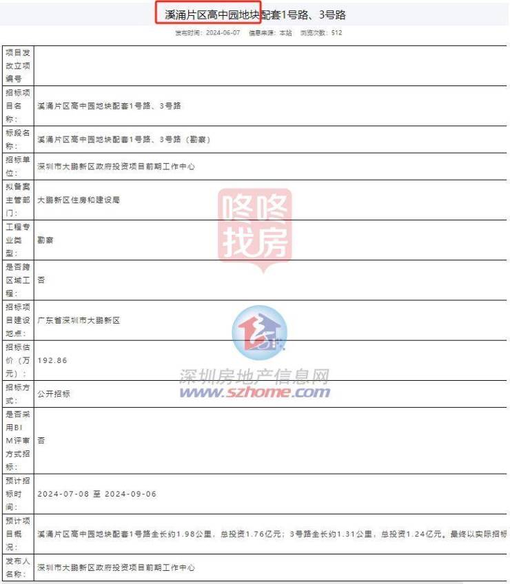 今年6月,深圳市公共资源交易中心发布了《溪涌片区高中园地块配套1号路、3号路》的招标计划。