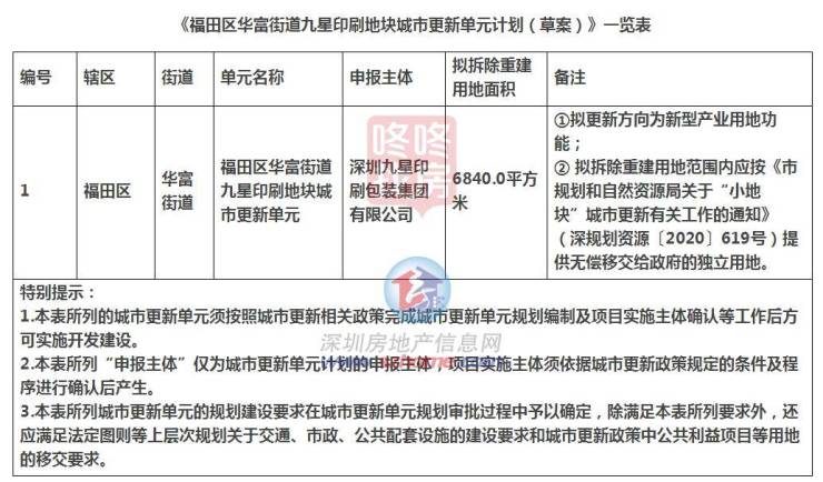 华富街道九星印刷地块列入计划(草案)》公示,申报主体为深圳九星印刷包装集团有限公司,拟拆除重建用地面积6840.0平方米,拟更新方向为新型产业用地功能。