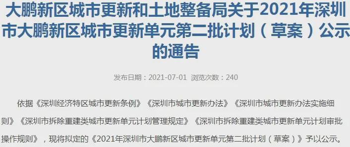 7月1日,大鹏新区城市更新和土地整备局发布2021年深圳市大鹏新区城市更新单元第二批计划(草案)。