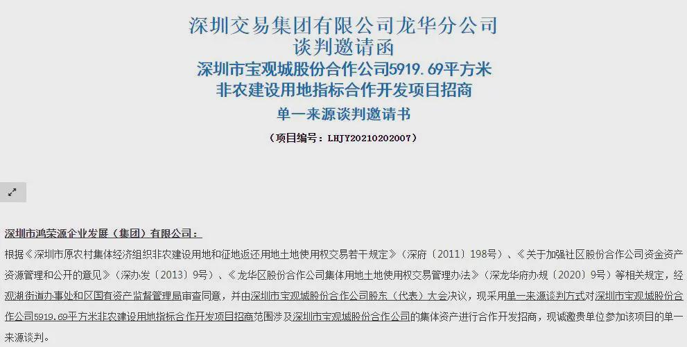 6月30日,深圳交易集团有限公司龙华分公司发布关于深圳市宝观城股份合作公司5919.69㎡非农建设用地指标合作开发项目招商谈判邀请函,鸿荣源集团为被邀请方。