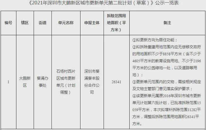 大鹏新区发布第二批计划草案:石场村西片区项目拟增拆除范围