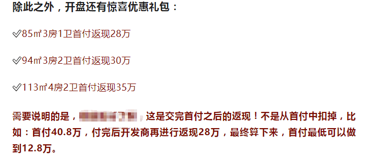 而中介渠道透露,除开盘优惠外,项目还有“惊喜优惠礼包”,而礼包即为“返现”,交首付后返现金额28-35万不等,算下来的起步首付只需要13万不到。搜狐焦点致电售楼处,得到肯定的答复,不过这是否是合规操作,大家还需谨慎行事。