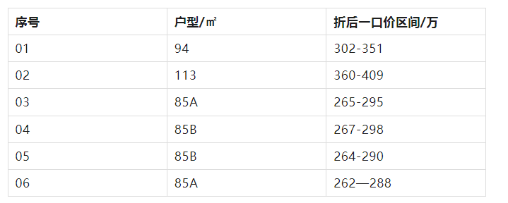 据悉,项目开盘折扣约85折,折后总价约262万起,整区间如下: