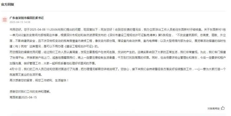 而福田的东园新村事件后续则是,区街道办的回复将搭建了协调平台,并且会督促各方落实好后续整改工作。
