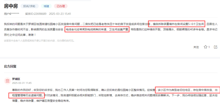 据领导留言板有业主留言,罗湖楼龄快40年的老旧小区松园南小区出现改造“房中房”问题,二手房房东擅自拆除承重墙并在房间设置5~6个卫生间,居住人员复杂以及作息时间不定,同时,因改造后导致的安全隐患也日益突出,严重影响小区业主的生活质量与安全。