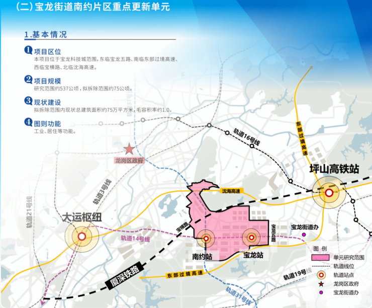 本项目位于宝龙街道东部高铁枢纽片区,东临深汕路、南临厦深铁路、西临水流田公园、北临沈海高速;研究范围约191公顷,拟拆除范围约116公顷;拟拆除范围内现状总建筑面积约127万平方米,毛容积率约1.09;图则主要以工业、居住为主。