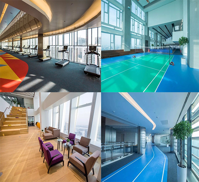 腾讯滨海大厦内部的运动空间总面积超过1.5万平方米,是目前国内较大的室内运动场所。与苹果总部不一样,这是2栋高达200多米的垂直建筑。在企鹅的新总部,这有一站式的运动设施设备:室内攀岩、恒温游泳池、室内空中跑道、室内篮球场、室内羽毛球场等;还有配套吧台、舞蹈室和瑜伽室等!