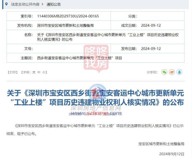 9月12日,宝安发布了西乡街道宝安客运中心城市更新单元“工业上楼”项目历史违建物业权利人核实情况,此前该情况已进行公示,目前正式对外公布。