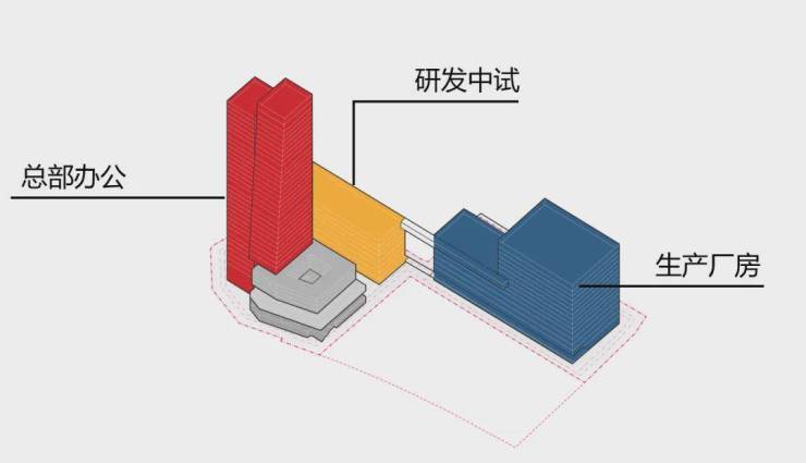 在规划出最佳用地形式的基础上,我们也同样注重其产业布局形态的清晰明了,能满足产业研发一体化需求。我们将产业布局分为3部分,包括其原有设计要求的“总部办公”、“生产厂房”两部分,还包括我们拆分出来的新厂房,它将作为布局研发实验室及中试平台,推动产业创新。其中:
