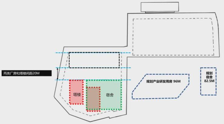 另一方面,我们遵循规范要求,将塔楼和宿舍统一放在南侧地块,塔楼和新腾挪的厂房2(丙类厂房)之间形成了一个20m的友好间距。这样不仅保证了厂房的双面采光,在功能模式上也可独立运营,灵活出租,同时塔楼的品质也不会受厂房影响。