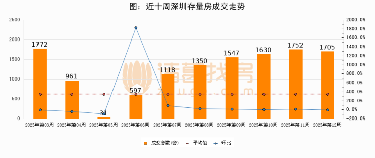 存量房方面,第12周深圳存量房成交1705套,较上周减少47套,环比下降2.7%。从近十周成交走势来看,周均成交套数为1246套,本周高于平均水平36.8%。