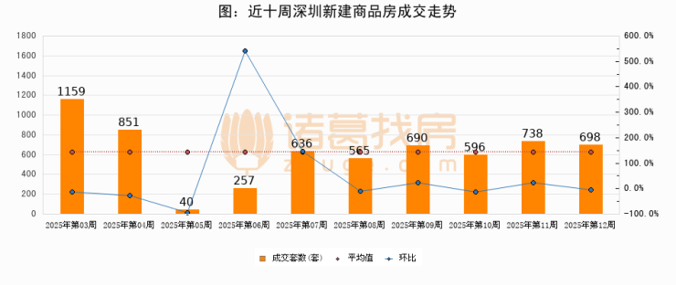进入2025年第12周(03月17日-03月23日),深圳新建商品房成交698套,较上周减少40套,环比下降5.4%