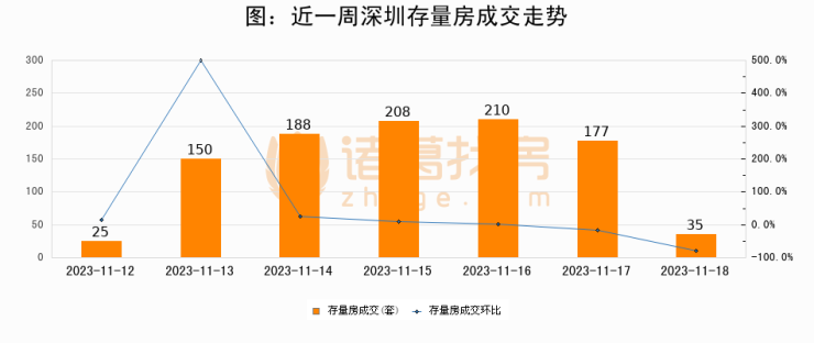 从存量房来看,2023年11月18日深圳存量房单日成交35套,比昨日减少142套,环比下降80.2%。从近一周存量房成交来看,深圳存量房日均成交套数为141套,11月18日单日成交35套,低于近一周平均水平75.2%。