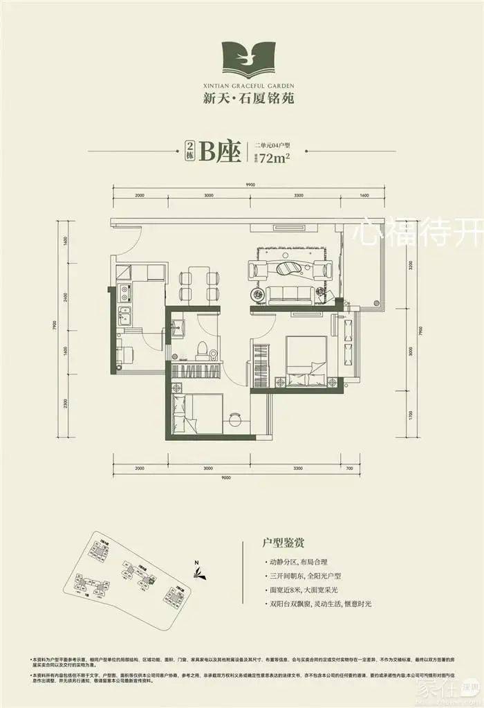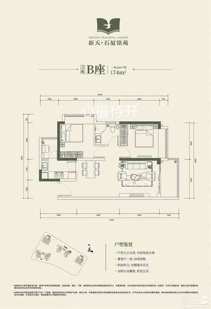 2栋B座二单元04、05户型:面积约为72-74㎡的2房2厅1卫。