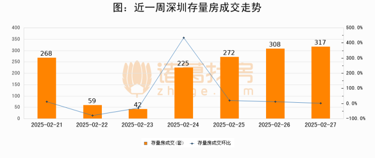 从存量房来看,2025年02月27日深圳存量房单日成交317套,比昨日增加9套,环比上涨2.9%。从近一周存量房成交来看,深圳存量房日均成交套数为213套,02月27日单日成交317套,高于近一周平均水平48.8%。