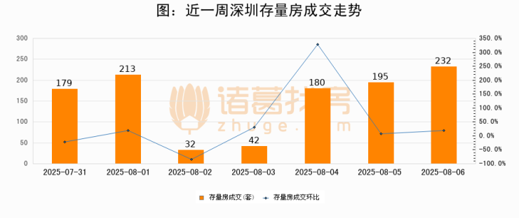 从存量房来看,2025年08月06日深圳存量房单日成交232套,比昨日增加37套,环比上涨19%。从近一周存量房成交来看,深圳存量房日均成交套数为153套,08月06日单日成交232套,高于近一周平均水平51.6%。