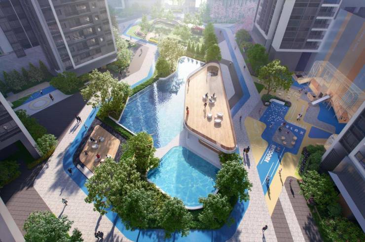 社区打造城市会客厅、稚趣IP乐园、亲子双游泳池、空中运动花园(公配)等多元聚场,亲子、社交、远动一应俱全