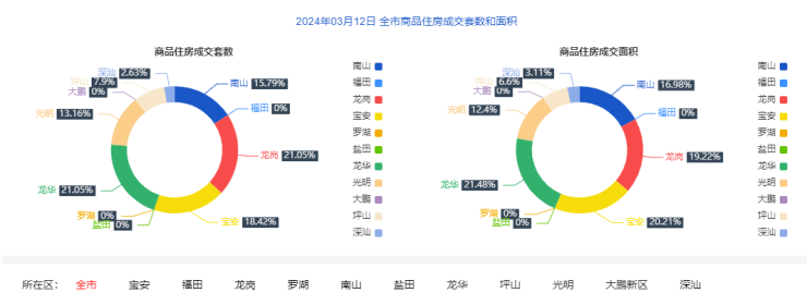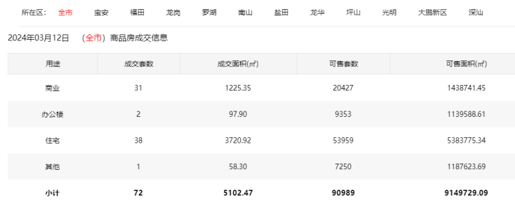 2024年3月12日新房住宅共网签38套。宝安7套;福田0套;龙岗8套;罗湖0套;南山6套;盐田0套;龙华8套;坪山3套;光明5套;大鹏0套;深汕1套。