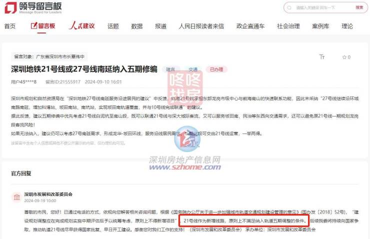 近日,有深圳市民在人民网领导留言板留言,询问深圳地铁21号线或27号线南延是否有机会纳入五期修编,深圳相关部门进行答复。