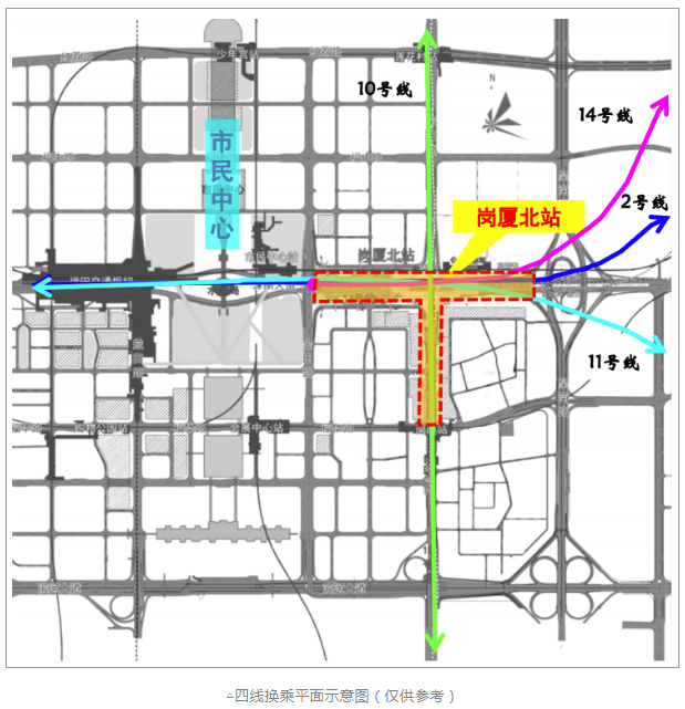2024年年中,位于福田中心区的岗厦北综合交通枢纽启用。岗厦北枢纽不仅是2号线、10号线、11号线和14号线的4线换乘车站。