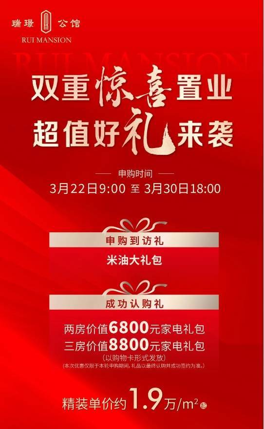 项目配售均价22251.81元/㎡,起步单价约1.9万/㎡。项目申购到访享米油大礼包,成功认购两房享6800元家电礼包,三房享8800元家电礼包(具体以开发商现场为准)。