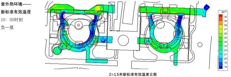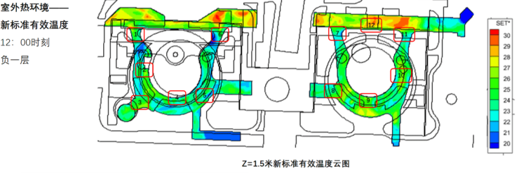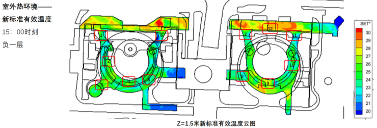 SET模拟分析软件结果显示,在夏季主导风速条件下,不同时段覆盖式通廊、半覆盖式架空等盖下区域受太阳辐射影响较小,综合室内26℃空调冷环境,标准有效温度约在25℃-27℃区间,整体空间舒适度较好,可满足人行舒适需求。