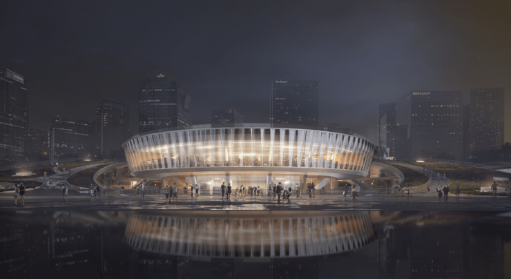 古老东方哲学天圆地方布局理念下生成的玉盘造型,通过高7.8米、直径2.5米的高透弯弧玻璃幕墙来表现湾区之眼‘玉盘’元素立面的干净和空间的纯粹,而独特造型下西晒和弯弧玻璃的视觉眩晕则为室内空间舒适性需求的难点。