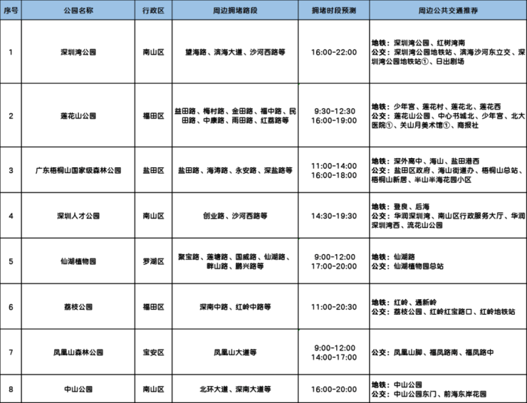 预计全市出行热度较高的公园有深圳湾公园、莲花山公园、广东梧桐山国家级森林公园、深圳人才公园、仙湖植物园、荔枝公园、凤凰山森林公园、中山公园等。