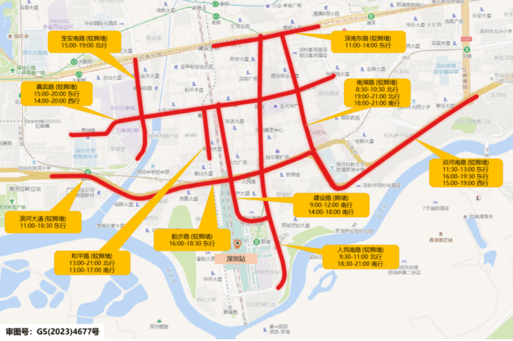 铁路离深高峰期深圳站(罗湖口岸)周边拥堵路段主要分布在建设路、滨河大道、沿河南路等,具体分布如下——