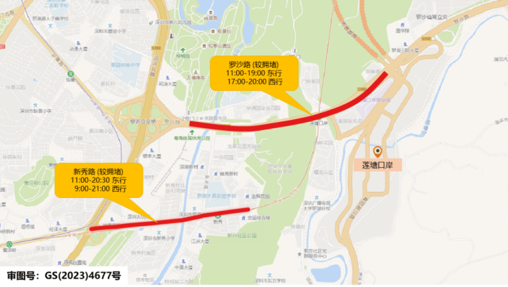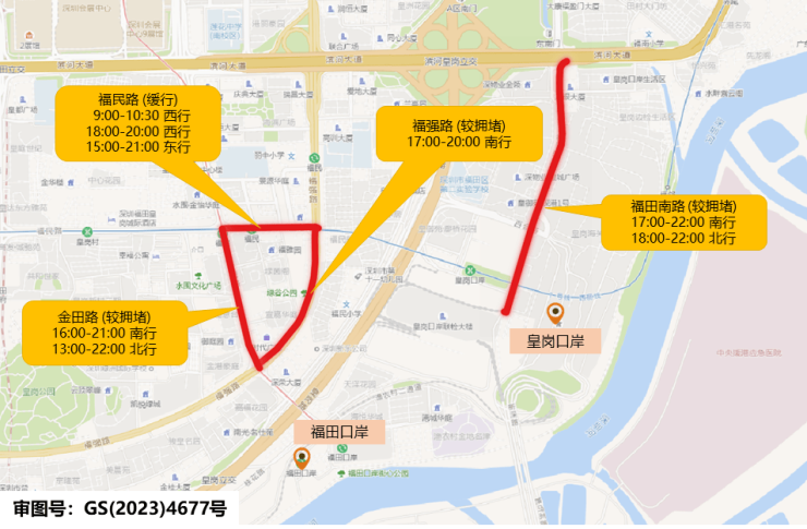 出行高峰期期间,预计福田口岸、皇岗口岸、深圳湾口岸、莲塘口岸等通关口岸周边拥堵道路包括金田路、科苑南路、新秀路等,具体分布如下——