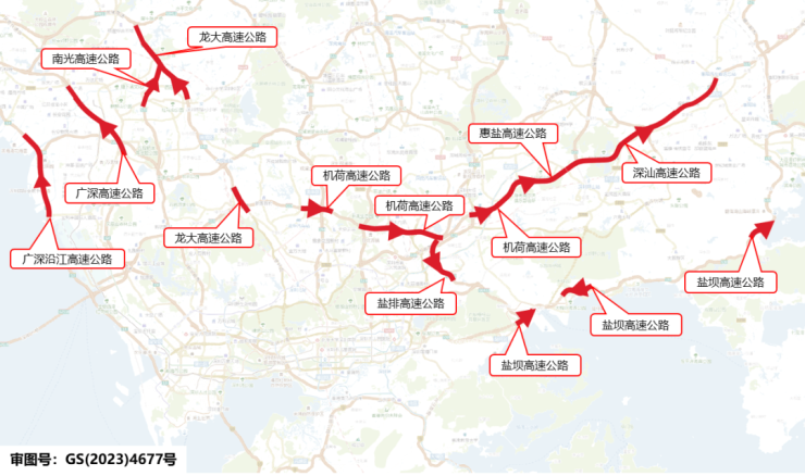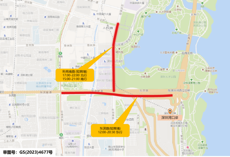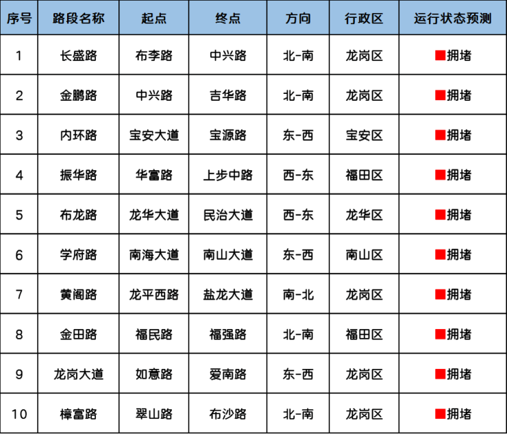 预计假期期间,龙岗区长盛路、金鹏路、黄阁路、龙岗大道、樟富路,宝安区内环路,福田区振华路、金田路,龙华区布龙路,南山区学府路等部分路段交通运行压力较为显著。